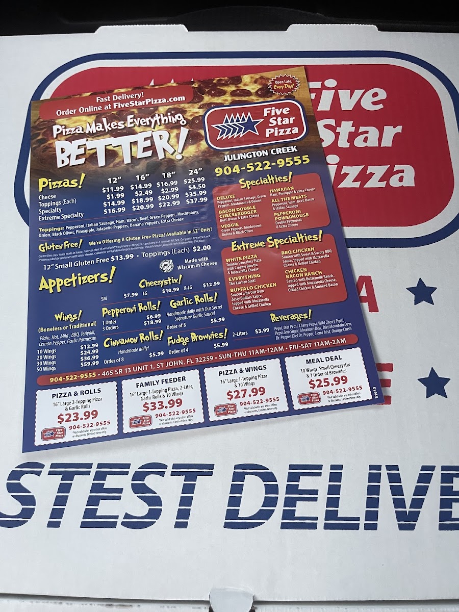 Not just pizza, indulge in warm Cinnamon Rolls and rich Fudge Brownies, making every meal a celebration. Renowned for exceptional service and timely deliveries, Five Star Pizza is perfect for pick-up or delivery. With glowing reviews from loyal customers citing their penchant for quality and flavor, it's clear why this pizza spot is a local favorite. Experience pizza done right at Five Star Pizza - St Johns!